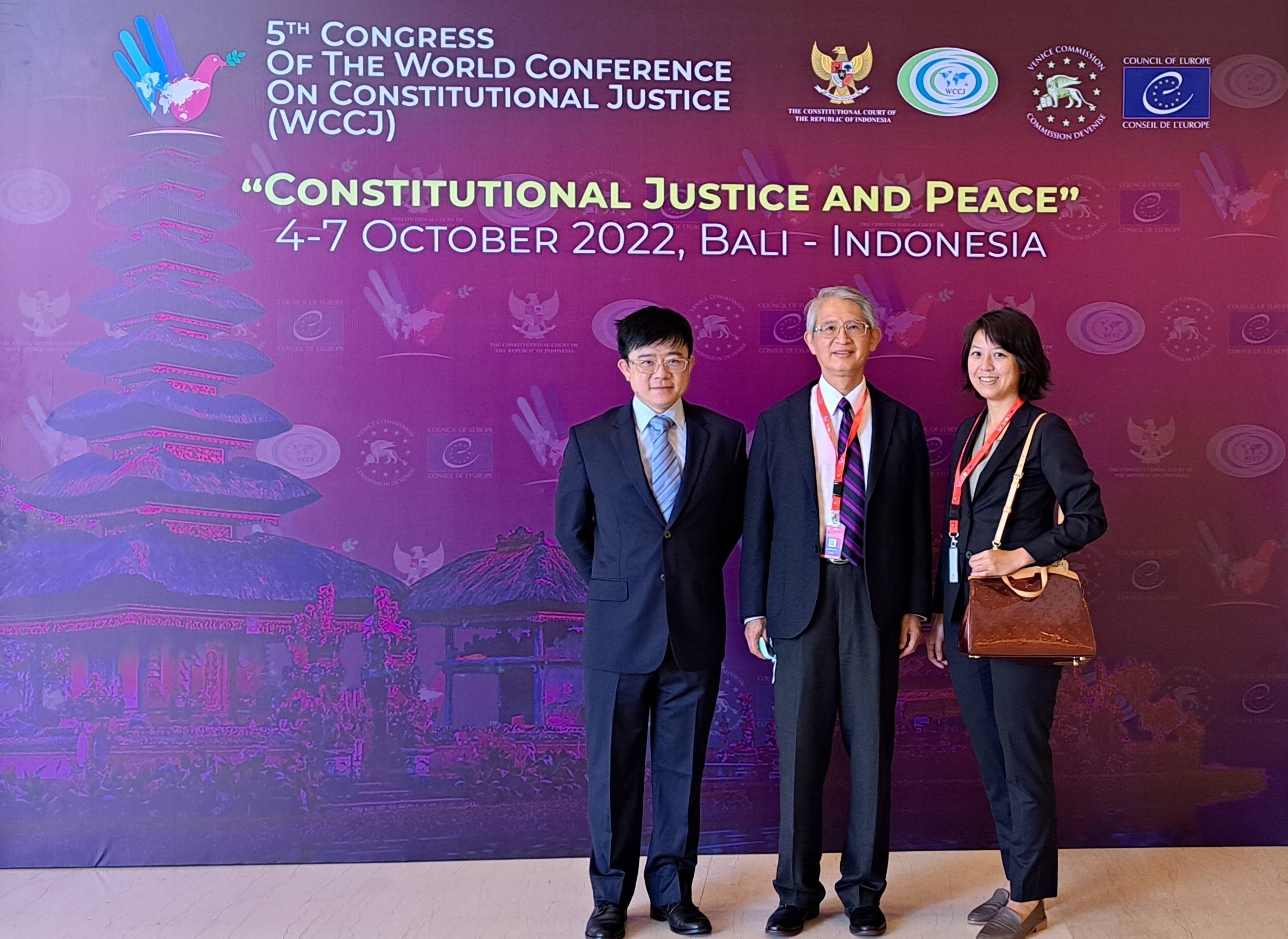 司法院許宗力院長受威尼斯委員會(Venice Commission)秘書長Dr.Schnutz Dürr邀請參加10月4日至7日由印尼憲法法院於峇里島主辦之第5屆世界憲法法院大會(World Conference on Constitutional Justice,WCCJ),指派謝銘洋大法官(圖中)率憲法法庭書記廳許辰舟廳長(左)、李奕逸法官(右)與會。此為繼許院長於2017年參與由立陶宛憲法法院主辦之第4屆大會後,我國代表團第2度以非會員身分參加。