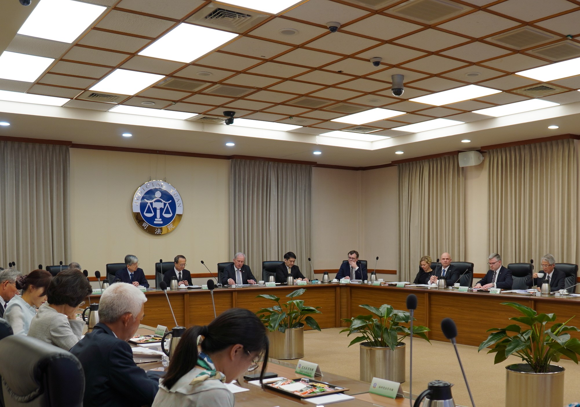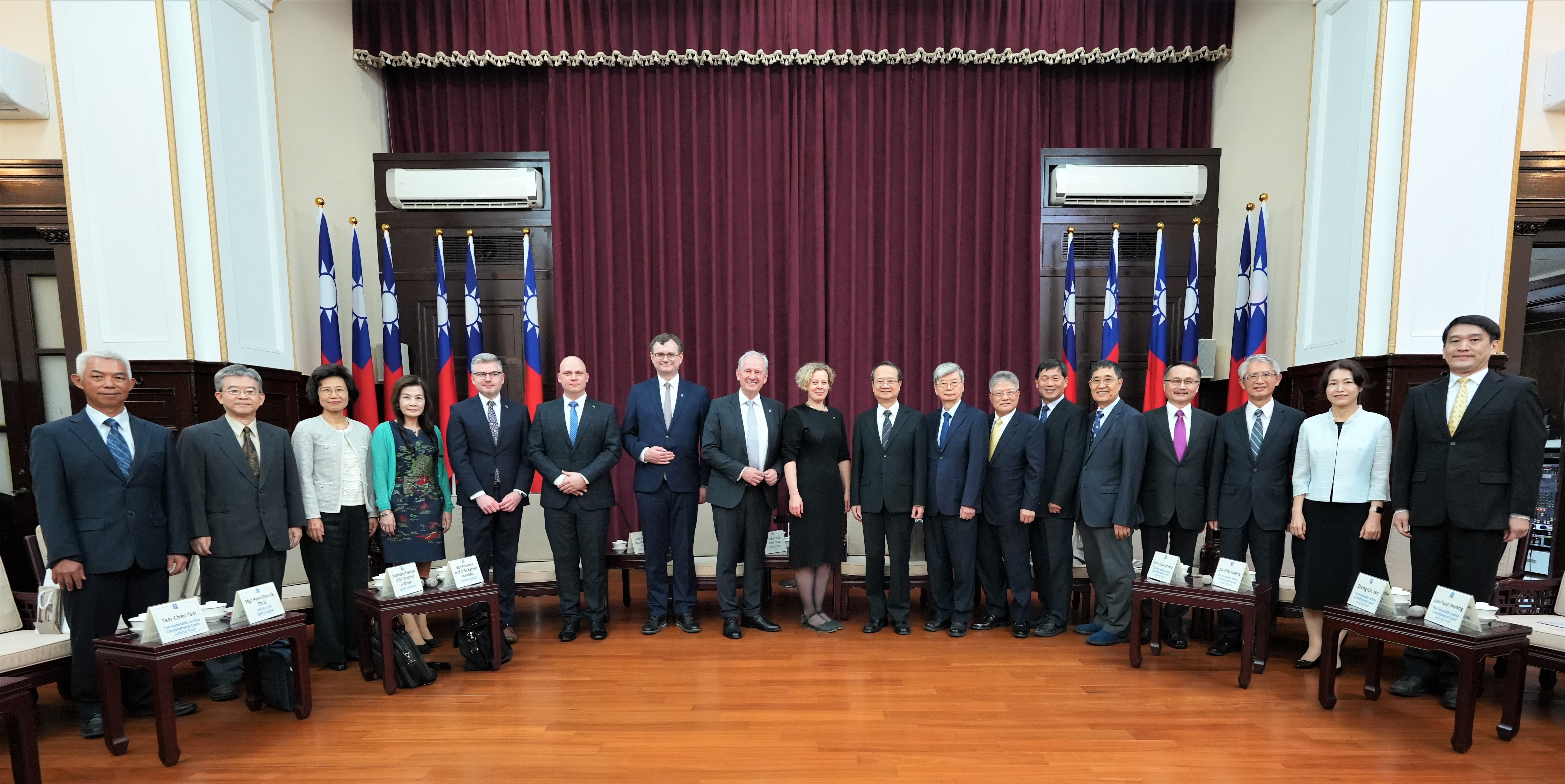 為持續強化臺、捷雙方憲法審判機關之交流,本院大法官決議邀請捷克憲法法院院長Josef Baxa訪臺(照片左8), Baxa院長慨允並偕同該院副院長Vojtěch Šimíček(照片左7)、Kateřina Ronovská(照片左9),以及秘書長Vlastimil Göttinger(照片左6)、國際交流處處長Pavel Dvořák(照片左5)等一行來臺進行司法交流。訪團於4月16日下午拜會許宗力院長,並由蔡烱燉副院長及許志雄、黃瑞明、詹森林、黃昭元、謝銘洋、蔡宗珍、蔡彩貞、朱富美、陳忠五、尤伯祥大法官,與憲法法庭書記廳楊皓清廳長陪同接見。Baxa院長表達訪團對於台灣花蓮震災的關心,以及對於我國人民的韌性印象深刻,許院長表示感謝,也希望能建立雙方憲法審判機關的常態性學術交流。拜會結束後,Baxa院長隨即以「由歷史角度看捷克共和國憲法法院」為題發表專題演講。(專題演講全文另登載司法周刊)