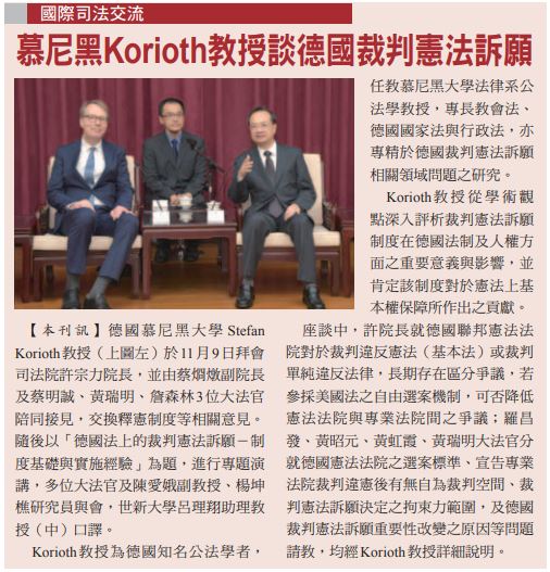 司法院於2017年11月9日邀請德國慕尼黑大學教授Prof. Dr. Stefan Korioth,專題演講「德國法上的裁判憲法訴願-制度基礎與施行經驗」,並於演講前拜會許宗力院長及多位大法官,交流意見。