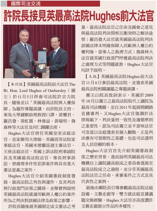 司法院於2018年11月5日邀請英國最高法院前大法官The Rt. Hon. Lord Hughes of Ombersley專題演講「英國最高法院與人權保障」,並於演講前拜會許宗力院長及多位大法官,交流意見。