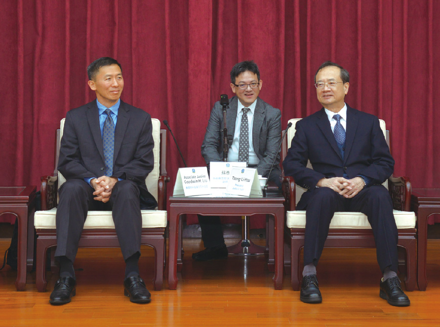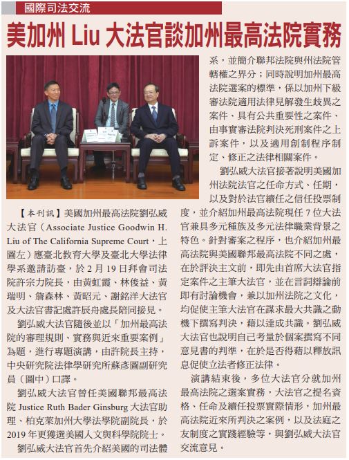 司法院於2020年2月19日邀請美國加州最高法院劉弘威大法官(Associate Justice Goodwin H. Liu of the California Supreme Court,上圖左)專題演講「加州最高法院的審理規則、實務與近來重要案例」,並於演講前拜會許宗力院長及多位大法官,交流意見。