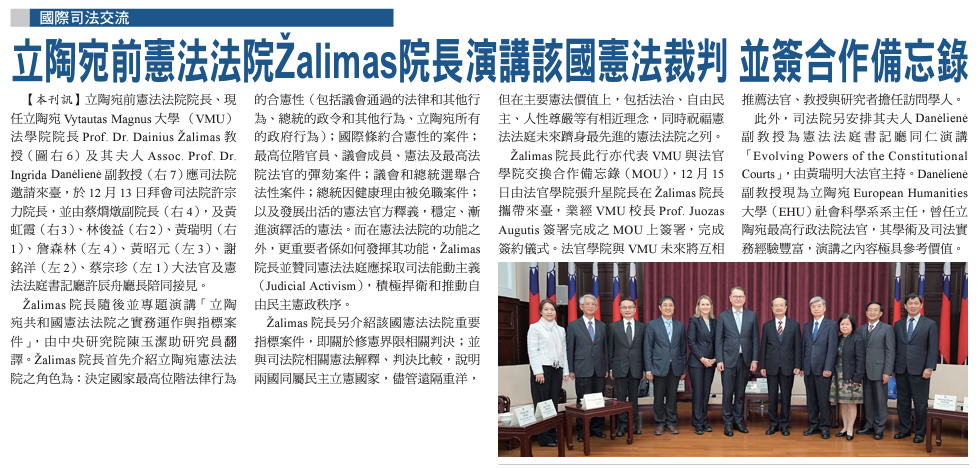 司法院於2022年12月13日邀請立陶宛共和國前憲法法院院長Prof. Dr. Dainius Žalimas,專題演講「立陶宛共和國憲法法院之實務運作與指標案件」,並於演講前拜會許宗力院長及多位大法官,交流意見。